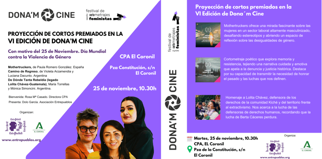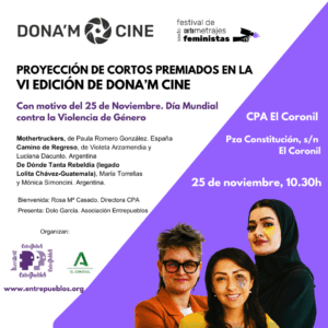 Con ocasión de la celebración del 25N, Día Mundial contra la Violencia de Género desde Entrepueblos queremos reivindicar la presencia de las mujeres como creadoras audiovisuales desde una perspectiva transformadora. Para ello realizamos la proyección de algunos de los cortos finalistas de la VI Edición del Festival Dona´m Cine en El Coronil. Sevilla.