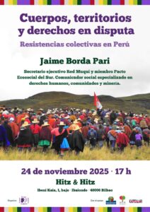 Dentro de la Gira «Cuerpos, territorios y derechos en disputa. Resistencias colectivas en Perú» os invitamos al conversatorio sobre «Ética, Política, Política y Democracia. Crisis de civilización. Defensa del territorio y derechos humanos en Perú» dentro del Seminario Permanente Kapuscinski de Periodismo y Derechos Humanos. Con la ponencia de Jaume Borda Pari, periodista especializado en Derechos Humanos y Secretario Ejecutivo Red Muqui Perú.