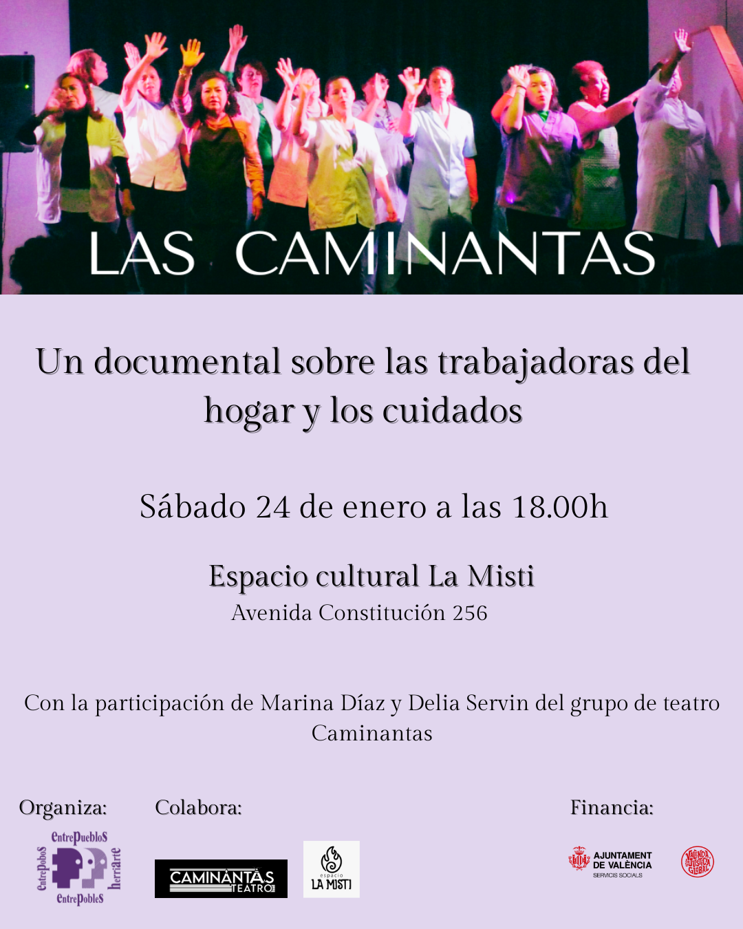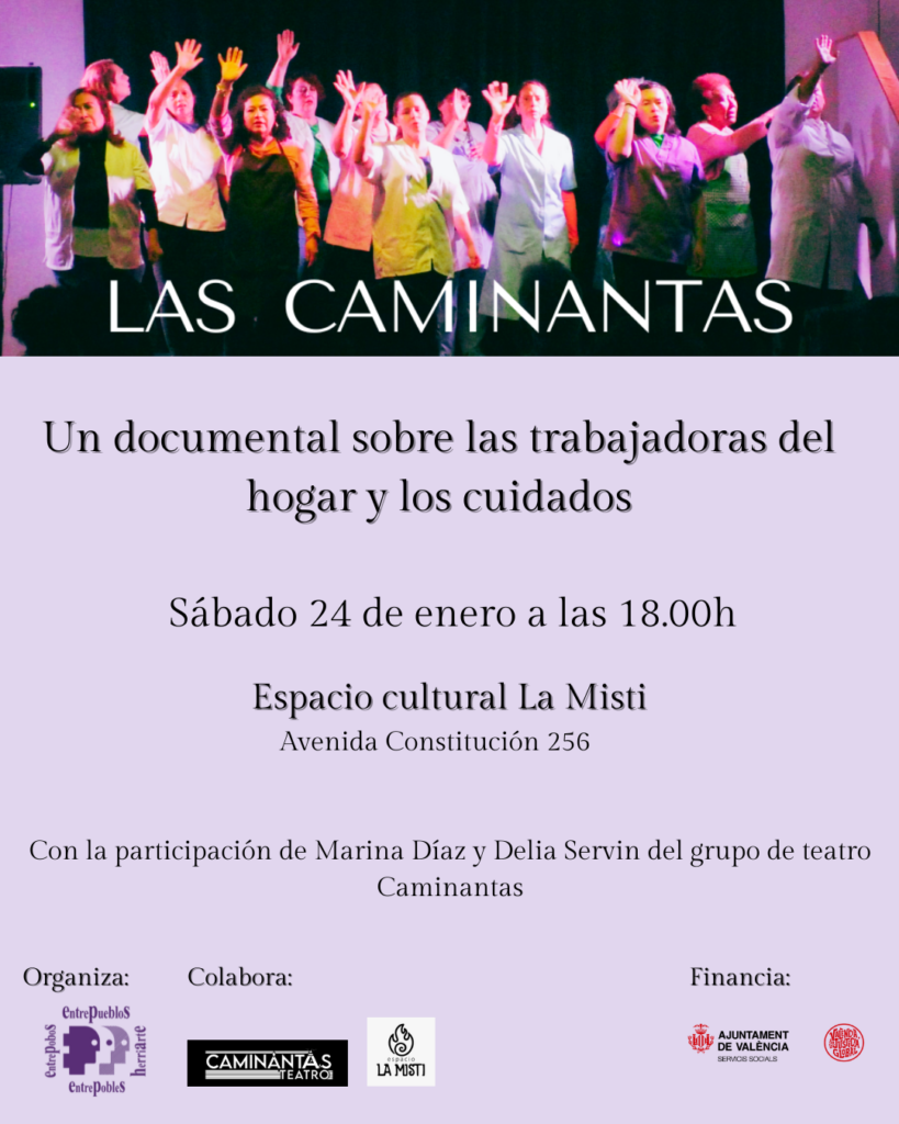 Este sábado 24 de enero a las 18 horas, en el espacio cultural La Misti (Avenida Constitución 256) la organización de solidaridad internacionalista Entrepueblos, en colaboración con el colectivo Las Caminantas Teatro, estrena en València el documental «Las Caminantas», que aborda las luchas y resistencias de las personas migrantes que realizan trabajos relacionados con el sector del hogar y los cuidados y sus condiciones precarias