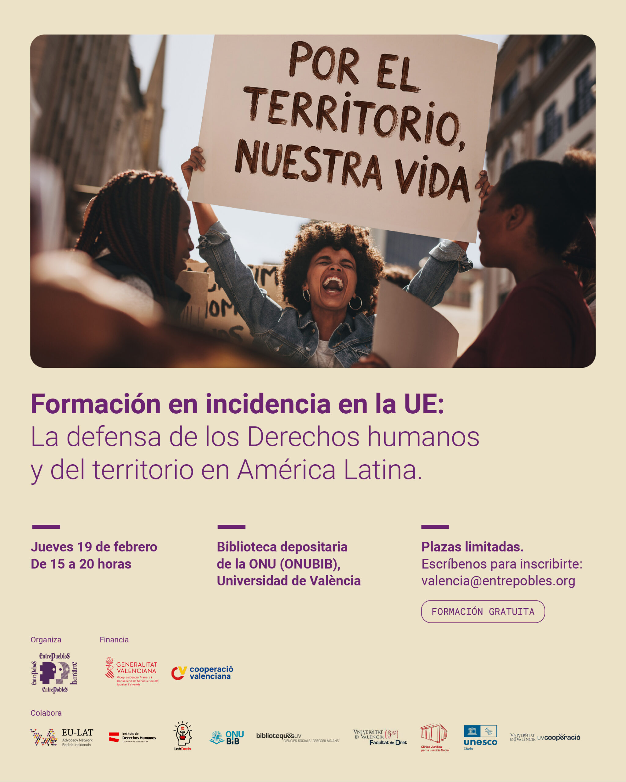 Desde Entrrepueblos organizamos el próximo jueves 19 de febrero de 15 a 20h., la formación Incidencia en la Unión europea: la defensa de los Derechos humanos y del territorio en América Latina junto con EULAT y con la colaboración de la Facultad de Derecho de la Universitat de València y el ONUBIB.