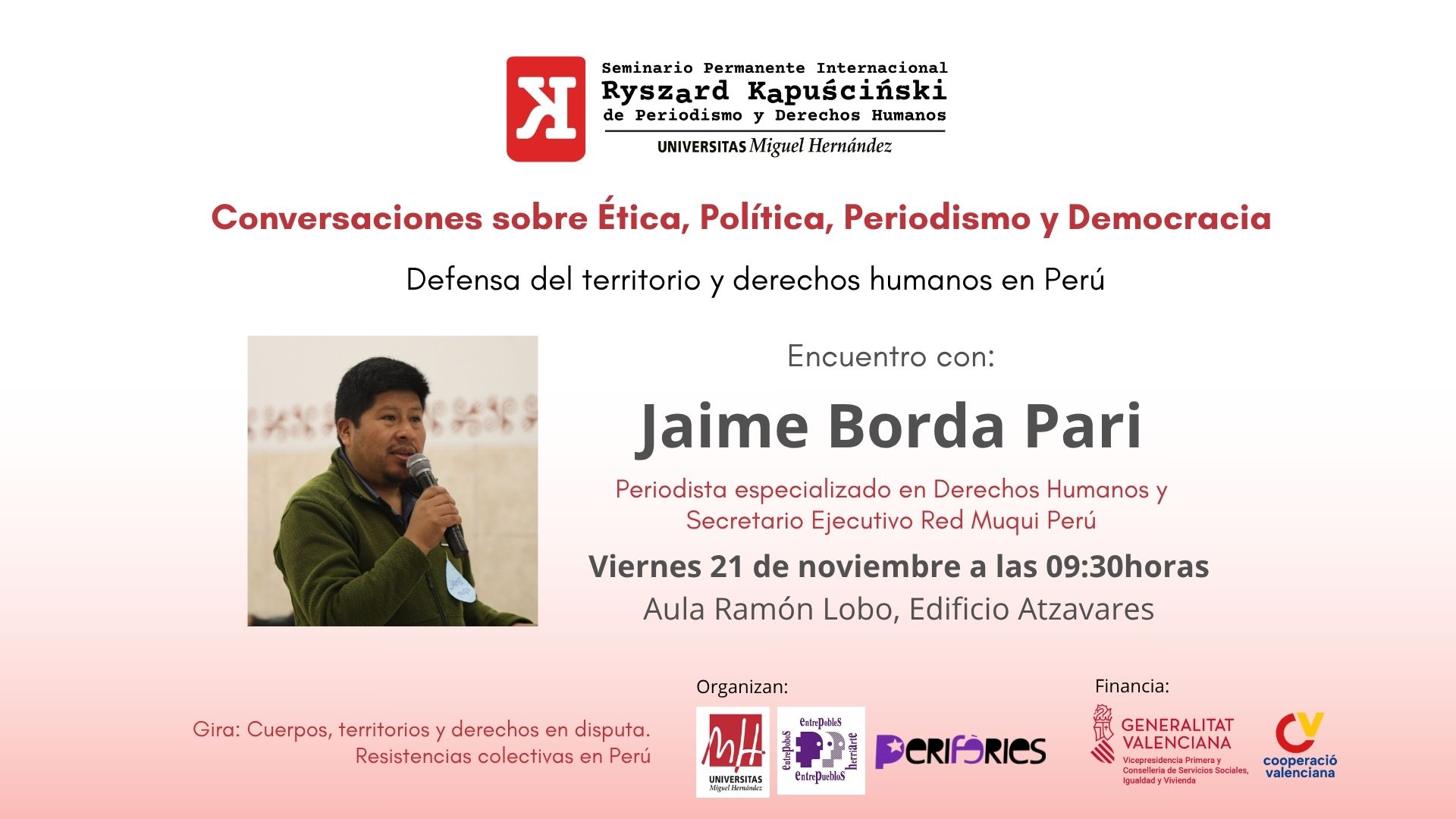 Dentro de la Gira “Cuerpos, territorios y derechos en disputa. Resistencias colectivas en Perú” os invitamos al conversatorio sobre “Ética, Política, Política y Democracia. Crisis de civilización. Defensa del territorio y derechos humanos en Perú” dentro del Seminario Permanente Kapuscinski de Periodismo y Derechos Humanos. Con la ponencia de Jaume Borda Pari, periodista especializado en Derechos Humanos y Secretario Ejecutivo Red Muqui Perú.