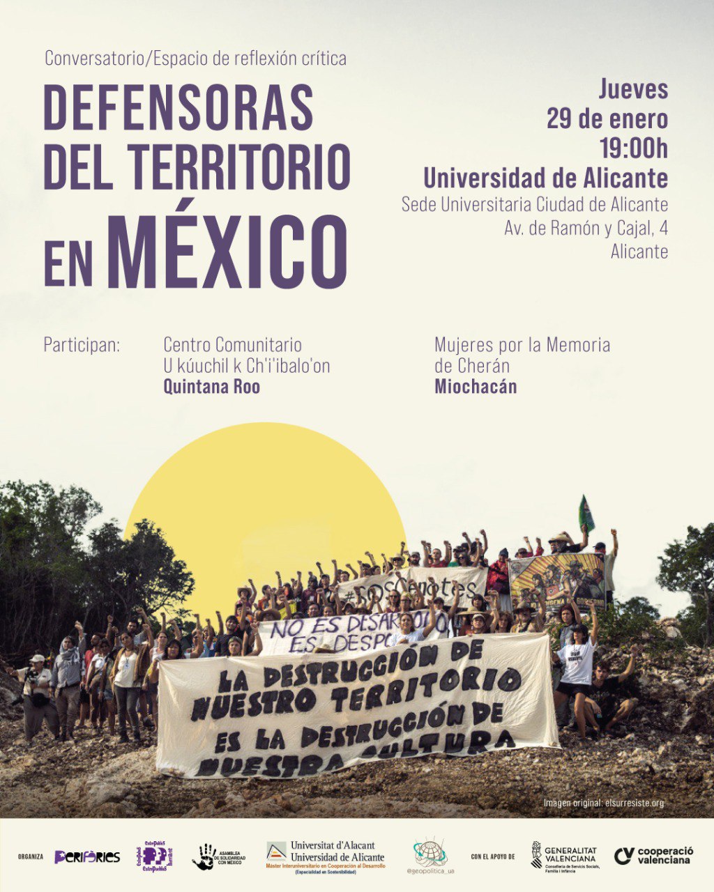 💜 Organitzen: Perifèries, Entrepobles, Assemblea de Solidaritat amb Mèxic, Màster Cooperació UA i Grup d’Investigació Geopolítica UA.