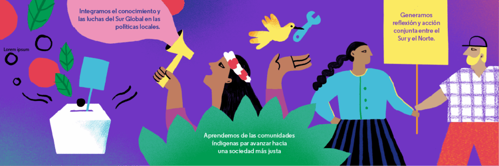 Busquem consolidar alternatives sostenibles inspirades en les genealogies ecosocials i feministes de les comunitats indígenes del Sud Global, afavorint un diàleg constant entre el Nord i el Sud que enriqueixi les accions locals i globals.