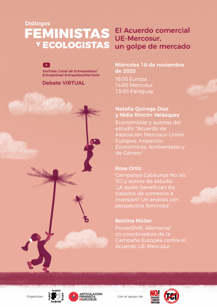 Para resolver estas incógnitas, Entrepueblos, junto con la Articulación Feminista Marcosur y con el apoyo de la Campaña No a los Tratados de Comercio e Inversión, ha organizado, dentro del marco de las jornadas internacionales Diálogos Feministas y Ecologistas, un debate virtual en formato webinar: El acuerdo comercial UE-Mercosur, un golpe de mercado.