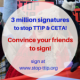 Tras superar los 3 millones de firmas, la Iniciativa Ciudadana Europea contra los Tratados de Libre Comercio, formada por 314 organizaciones de la sociedad civil de toda Europa –entre ellas Entrepueblos-, lanzaron el pasado mes de octubre una campaña de recogida de firmas, cuyo plazo terminó el pasado día 6 de octubre, contra el controvertido acuerdo comercial que la UE y EE.UU. están negociando a espaldas de la ciudadanía.