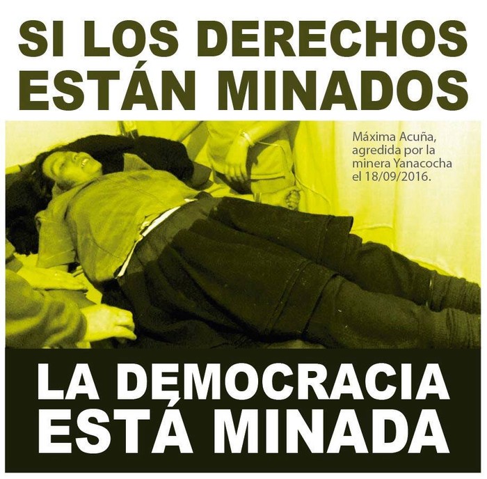 Con total indignación condenamos enérgicamente los ataques perpetrados contra Máxima y su esposo por parte de la empresa minera Yanacocha, que insiste en invadir la propiedad de Máxima con violencia, exigimos se sancione a los autores de las agresiones.