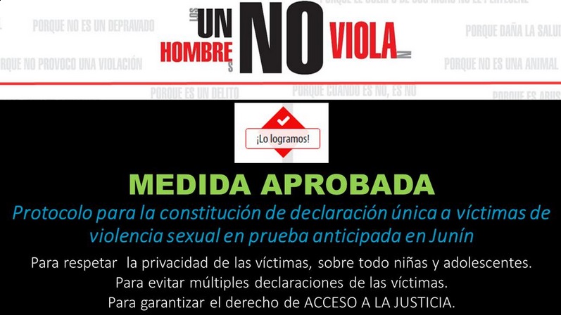 Se acaba de aprobar un protocolo en la región Junín por parte de todas las autoridades de justicia de esa región, que permite establecer pautas para que la declaración de las víctimas de violación pueda constituirse como prueba anticipada en el procesos. Este era un obstáculo que detectamos en el trabajo con magistrados/as y con mujeres organizadas. Además contribuye a no seguir re victimizando con múltiples declaraciones de las víctimas durante todo el proceso judicial.