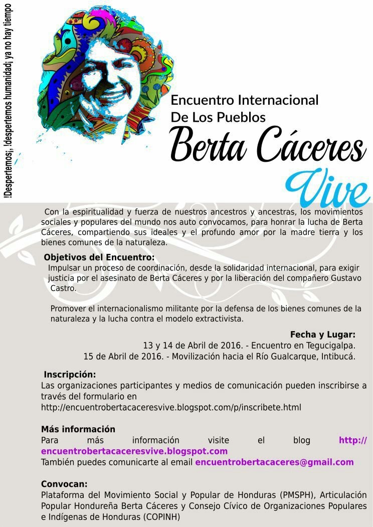 maite2016-03-30 14:30:002016-03-30 14:30:00Tegucigalpa 13 al 15 de abril: Encuentro Internacional de los Pueblos “BERTA CACERES VIVE”ÚLTIMAS NOTICIAS